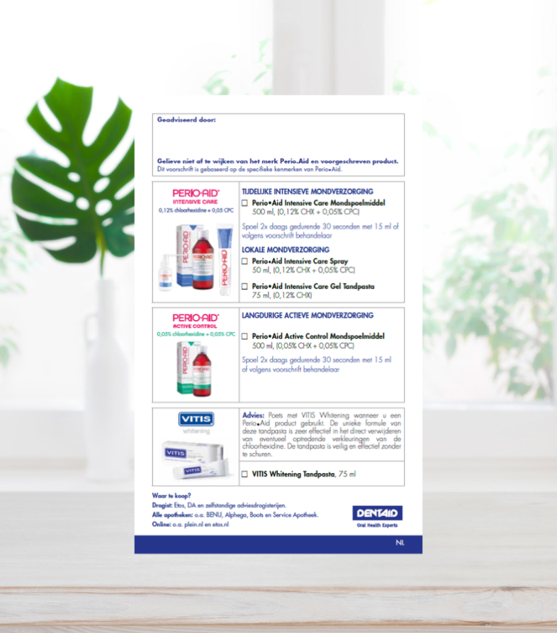 Om uw patiënt gemakkelijk van een juist Perio.Aid productadvies te voorzien.